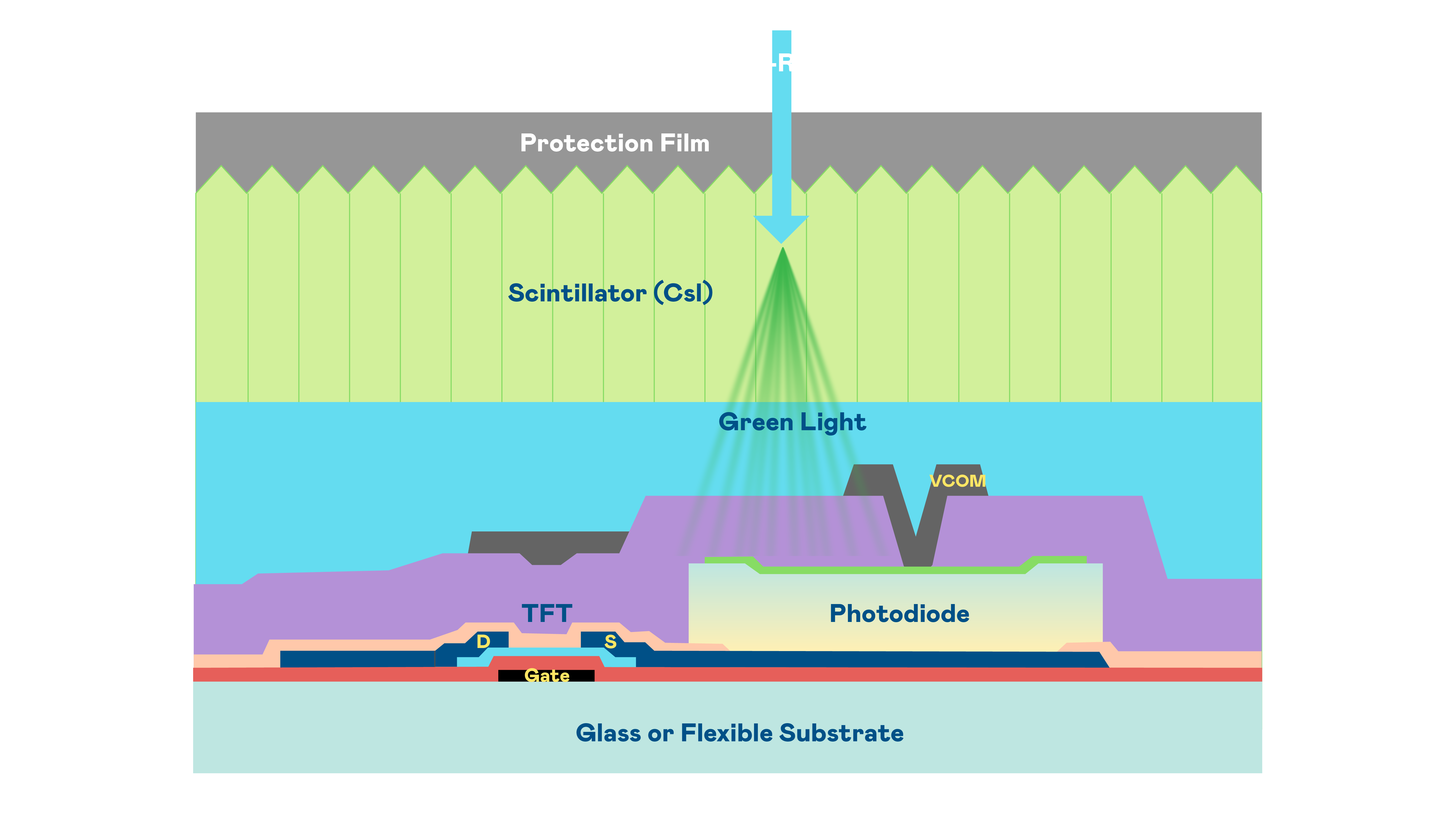 AG旗舰厅的X光影像感測陣列使用薄膜電晶體 (TFT) 作為每個像素的讀取開關,搭配光電二極體(Photodiode)的光電轉換元件,用以感測X光影像訊號。